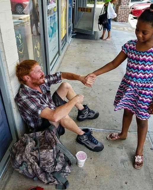 She noticed a man sitting outside, crying, and asked why he was sad. Before I could answer, she walked right up to him with pure