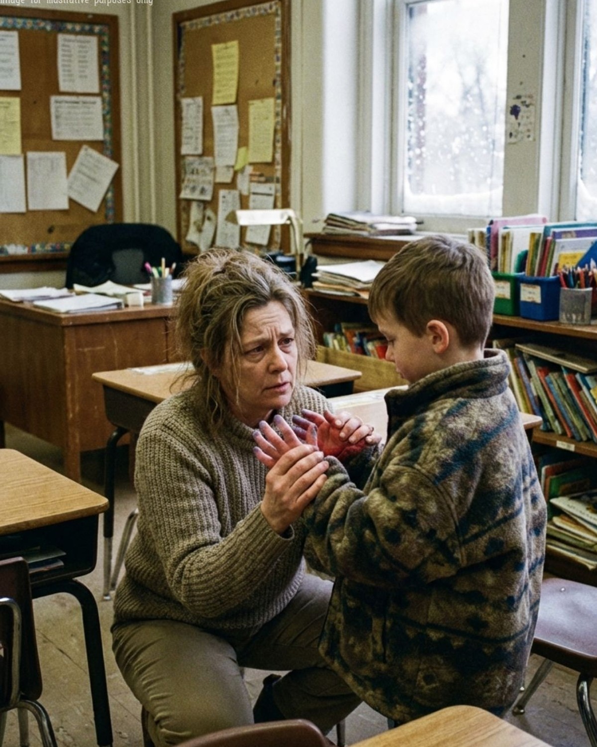 The kids are arriving in a tidal wave of small bodies and wet boots. They smell like cold air and cheap cereal. Jayden is first in, as always, shoulders hunched, eyes scanning the room like he’s checking for danger.