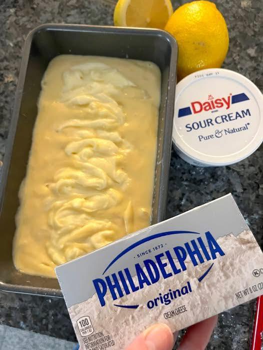 The batter comes together with the regular baking staples, the zest of two lemons, and a splash of lemon juice. Once you have that all mixed up, it’s time to start on the cream cheese swirl. This will be made with a block of softened cream cheese and a little powdered sugar for sweetness. The batter and cream cheese mixture are layered into the loaf pan and then swirled together for a beautiful marble look.