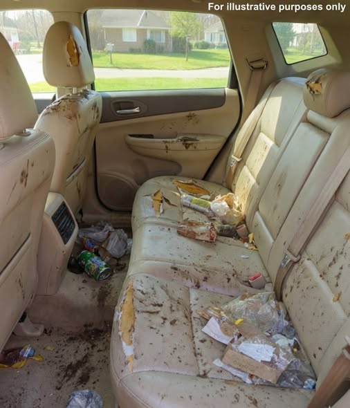 Crushed chips, sticky cup holders, crumbs, grease stains, juice spills on the seats, and fast-food bags everywhere. The smell hit me like a slap.
