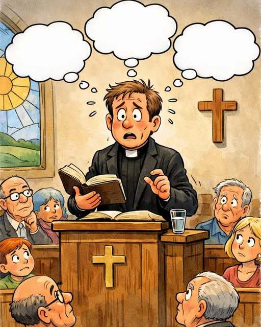 He tried one more time — speaking and gesturing with such force that he fell forward, knocking the pulpit to one side, tripping over the flower pot, and falling into the lap of a little old lady in the front row.