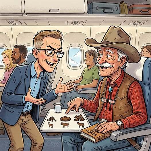 An atheist was seated next to an old cowboy on a plane and turned to him, saying, “Would you like to chat? Flights go faster when you strike up a conversation with your seatmate.”
