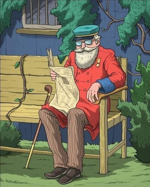 Our elderly subject exudes calm and focus, absorbed in reading a newspaper, seemingly unaware that an item dear to him has mysteriously disappeared from his possession, presenting the perfect scenario for a hidden object challenge.