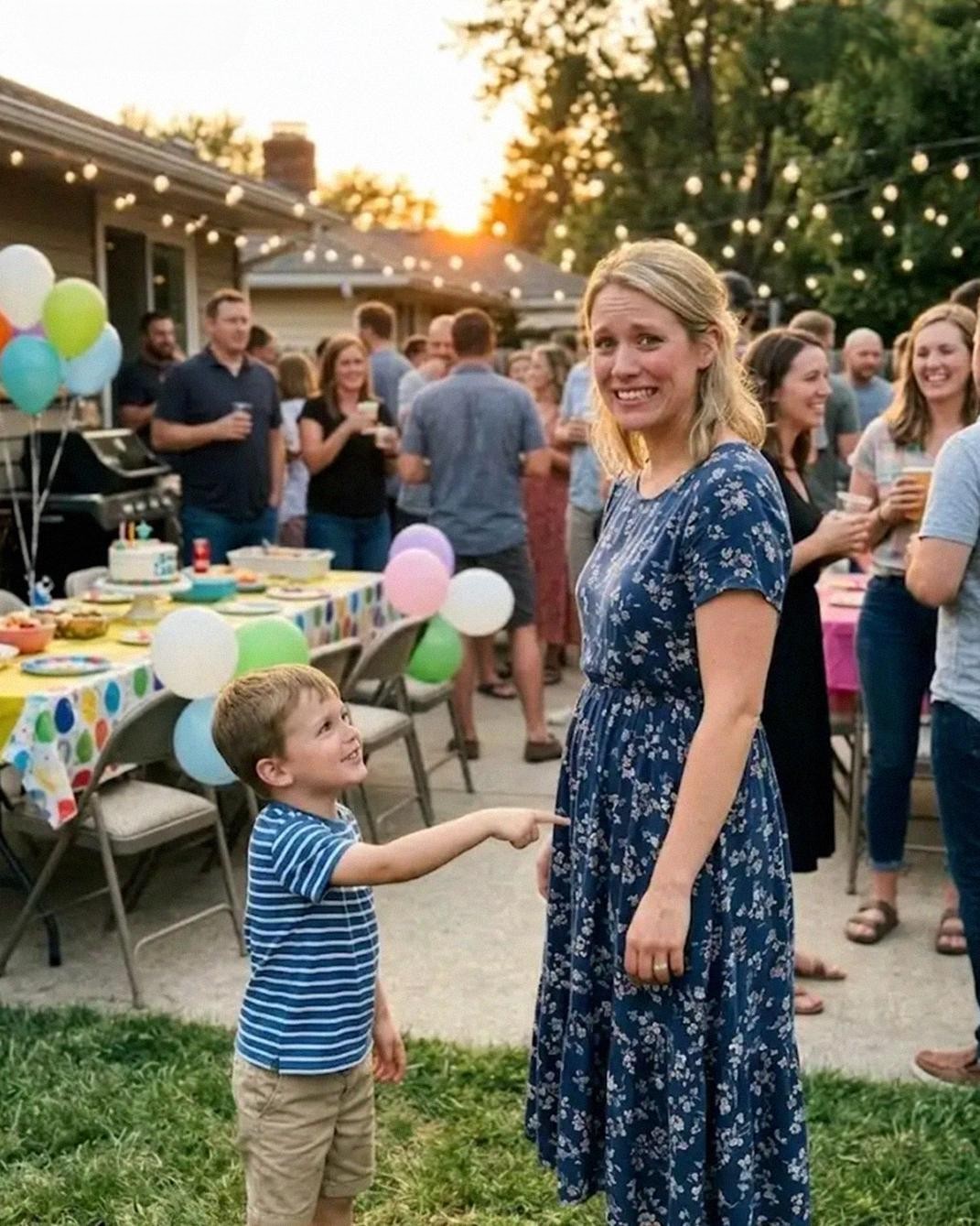 The afternoon was a blur of hosting duties until Will came sprinting toward me, his knees grass-stained and his face smeared with the remnants of a cake pop. I caught him by the wrist, laughing as I tried to lead him toward the kitchen sink for a cleanup before the official cake cutting. As I scrubbed his small, sticky hands, Will looked up at me with bright, mischievous eyes. He giggled, a sound that usually meant he’d found a hidden bug or a stray cat. “Aunt Ellie has Dad,” he whispered, pointing back toward the sliding glass door. I paused, the faucet still running. I asked him what he meant, assuming he was confused about a game or perhaps seeing Brad standing near her. But Will was insistent. “I saw it when I was playing under the table,” he said with the serious intensity that only a preschooler can muster. “Dad is on her tummy.”