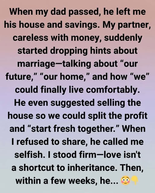 When you said no, he showed you exactly who he was. A partner who truly cared would have seen the house and savings as symbols of your father’s love and your safety, not a prize to be cashed out.