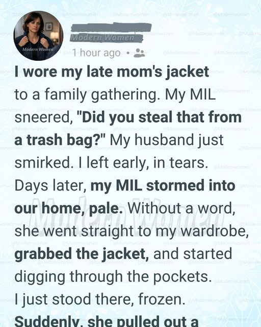 He had mentioned to his mother—casually—that my mom had actually been wealthy but chose to live modestly. That the jacket I wore was far more valuable than it looked.